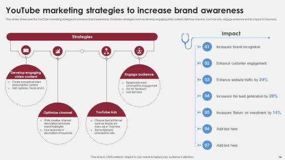 This slides showcases the YouTube marketing strategies to enhance brand awareness. It includes strategies such as develop engaging video content, optimize channel, YouTube ads, engage audience and its impact on business. Make sure to capture your audiences attention in your business displays with our gratis customizable Youtube Marketing Strategies To Increase Accelerating Market Share And Profitability MKT SS V. These are great for business strategies, office conferences, capital raising or task suggestions. If you desire to acquire more customers for your tech business and ensure they stay satisfied, create your own sales presentation with these plain slides. This slides showcases the YouTube marketing strategies to enhance brand awareness. It includes strategies such as develop engaging video content, optimize channel, YouTube ads, engage audience and its impact on business.