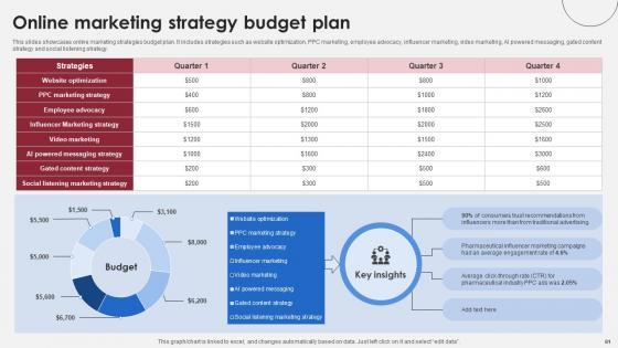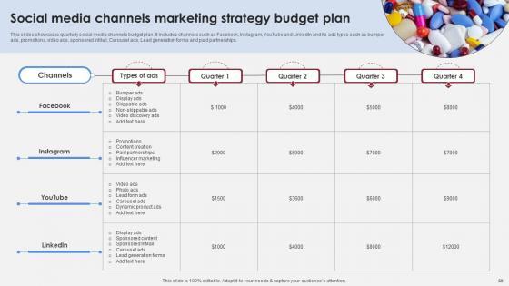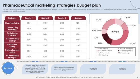 This slides showcases pharmaceutical marketing strategies budget plan. It includes strategies such as brand marketing, generic drug marketing, PCD pharma franchise, OTC marketing strategy, institutional supply, Online pharmacy selling and HCP marketing strategies. Do you know about Slidesgeeks Pharmaceutical Marketing Strategies Accelerating Market Share And Profitability MKT SS V These are perfect for delivering any kind od presentation. Using it, create PowerPoint presentations that communicate your ideas and engage audiences. Save time and effort by using our pre-designed presentation templates that are perfect for a wide range of topic. Our vast selection of designs covers a range of styles, from creative to business, and are all highly customizable and easy to edit. Download as a PowerPoint template or use them as Google Slides themes. This slides showcases pharmaceutical marketing strategies budget plan. It includes strategies such as brand marketing, generic drug marketing, PCD pharma franchise, OTC marketing strategy, institutional supply, Online pharmacy selling and HCP marketing strategies.
