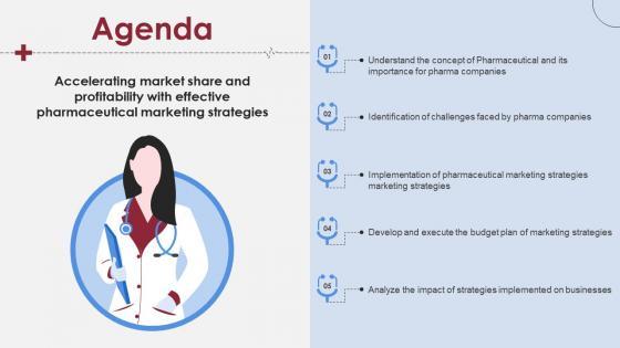 Create an editable Agenda Accelerating Market Share And Profitability With Effective Pharmaceutical Marketing Strategies that communicates your idea and engages your audience. Whether you are presenting a business or an educational presentation, pre-designed presentation templates help save time. Agenda Accelerating Market Share And Profitability With Effective Pharmaceutical Marketing Strategies is highly customizable and very easy to edit, covering many different styles from creative to business presentations. Slidegeeks has creative team members who have crafted amazing templates. So, go and get them without any delay. Our Agenda Accelerating Market Share And Profitability With Effective Pharmaceutical Marketing Strategies are topically designed to provide an attractive backdrop to any subject. Use them to look like a presentation pro.