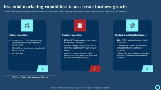 This slide covers essential marketing capabilities to accelerate business growth. It involves capabilities such as digital capabilities, content capabilities, big data and artificial intelligence. Boost your pitch with our creative Essential Marketing Capabilities To Accelerate Business Effective Strategies To Enhance Infographics Pdf Deliver an awe-inspiring pitch that will mesmerize everyone. Using these presentation templates you will surely catch everyones attention. You can browse the ppts collection on our website. We have researchers who are experts at creating the right content for the templates. So you do not have to invest time in any additional work. Just grab the template now and use them. This slide covers essential marketing capabilities to accelerate business growth. It involves capabilities such as digital capabilities, content capabilities, big data and artificial intelligence.