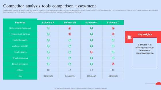 The following slide showcases comparative analysis of various tools used for performing competitor analysis and provide insights to develop marketing strategies. It showcases features such as social media monitoring, engagement tracking, content analysis, audience insights, trend analysis, brand monitoring, report generation, ratings and pricing. Explore a selection of the finest Competitor Analysis Tools Executing Competitors Strategies To Assess Organizational Performance Infographics Pdf here. With a plethora of professionally designed and pre made slide templates, you can quickly and easily find the right one for your upcoming presentation. You can use our Competitor Analysis Tools Executing Competitors Strategies To Assess Organizational Performance Infographics Pdf to effectively convey your message to a wider audience. Slidegeeks has done a lot of research before preparing these presentation templates. The content can be personalized and the slides are highly editable. Grab templates today from Slidegeeks. The following slide showcases comparative analysis of various tools used for performing competitor analysis and provide insights to develop marketing strategies. It showcases features such as social media monitoring, engagement tracking, content analysis, audience insights, trend analysis, brand monitoring, report generation, ratings and pricing.
