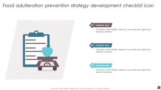 Showcasing this set of slides titled Food Adulteration Prevention Strategy Development Checklist Icon Icons Pdf. The topics addressed in these templates are Food Adulteration, Prevention Strategy, Development Check. All the content presented in this PPT design is completely editable. Download it and make adjustments in color, background, font etc. as per your unique business setting. Our Food Adulteration Prevention Strategy Development Checklist Icon Icons Pdf are topically designed to provide an attractive backdrop to any subject. Use them to look like a presentation pro.