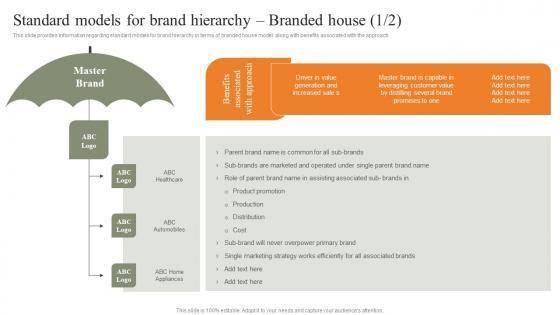This slide provides information regarding standard models for brand hierarchy in terms of house of brands along with benefits associated with the approach. Retrieve professionally designed Standard Models For Brand Hierarchy House Of Brands Strategies For Achieving Diagrams Pdf to effectively convey your message and captivate your listeners. Save time by selecting pre-made slideshows that are appropriate for various topics, from business to educational purposes. These themes come in many different styles, from creative to corporate, and all of them are easily adjustable and can be edited quickly. Access them as PowerPoint templates or as Google Slides themes. You do not have to go on a hunt for the perfect presentation because Slidegeeks got you covered from everywhere. This slide provides information regarding standard models for brand hierarchy in terms of house of brands along with benefits associated with the approach.