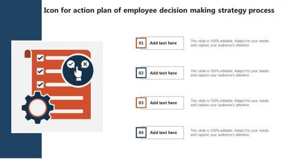 Showcasing this set of slides titled Icon For Action Plan Of Employee Decision Making Strategy Process Graphics Pdf The topics addressed in these templates are Icon For Action, Plan Employee, Decision Making Strategy Process All the content presented in this PPT design is completely editable. Download it and make adjustments in color, background, font etc. as per your unique business setting. Our Icon For Action Plan Of Employee Decision Making Strategy Process Graphics Pdf are topically designed to provide an attractive backdrop to any subject. Use them to look like a presentation pro.