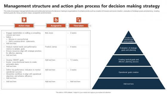 The slide showcases management structure and action plan process for decision making in organizations. It contains points such as creation of mission and vision creation , evaluation of strategic goals and planning , creating tactical goals etc. Along wit action steps, assigned to and time taken. Pitch your topic with ease and precision using this Management Structure And Action Plan Process For Decision Making Strategy Introduction Pdf This layout presents information on Operational Goals Creation, Planning Process, Evaluation Strategic It is also available for immediate download and adjustment. So, changes can be made in the color, design, graphics or any other component to create a unique layout. The slide showcases management structure and action plan process for decision making in organizations. It contains points such as creation of mission and vision creation , evaluation of strategic goals and planning , creating tactical goals etc. Along wit action steps, assigned to and time taken.