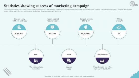 The following slide showcases various statistics that highlights successful performance of The Blair Witch Project marketing campaign to promote film among audience. It presents information about worldwide gross revenue, website visitors, budget, domestic opening, gross domestic box office revenue and all time ranking. If your project calls for a presentation, then Slidegeeks is your go-to partner because we have professionally designed, easy-to-edit templates that are perfect for any presentation. After downloading, you can easily edit Statistics Showing Success Of Marketing Strategic Plan To Increase Film Ppt Sample Strategy SS V and make the changes accordingly. You can rearrange slides or fill them with different images. Check out all the handy templates The following slide showcases various statistics that highlights successful performance of The Blair Witch Project marketing campaign to promote film among audience. It presents information about worldwide gross revenue, website visitors, budget, domestic opening, gross domestic box office revenue and all time ranking.