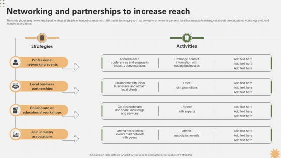 This slide showcases networking and partnerships strategy to enhance business reach. It includes techniques such as professional networking events, local business partnerships, collaborate on educational workshops and Joint industry associations. Retrieve professionally designed Networking And Partnerships To Increase Reach Strategy For Launching A Financial Strategy SS V to effectively convey your message and captivate your listeners. Save time by selecting pre-made slideshows that are appropriate for various topics, from business to educational purposes. These themes come in many different styles, from creative to corporate, and all of them are easily adjustable and can be edited quickly. Access them as PowerPoint templates or as Google Slides themes. You do not have to go on a hunt for the perfect presentation because Slidegeeks got you covered from everywhere. This slide showcases networking and partnerships strategy to enhance business reach. It includes techniques such as professional networking events, local business partnerships, collaborate on educational workshops and Joint industry associations.