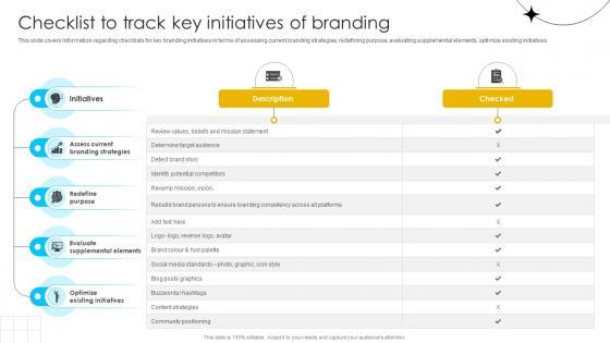 This slide covers information regarding checklists for key branding initiatives in terms of assessing current branding strategies, redefining purpose, evaluating supplemental elements, optimize existing initiatives. Find highly impressive Brand Influence Checklist To Track Key Initiatives Of Branding Strategy SS V on Slidegeeks to deliver a meaningful presentation. You can save an ample amount of time using these presentation templates. No need to worry to prepare everything from scratch because Slidegeeks experts have already done a huge research and work for you. You need to download Brand Influence Checklist To Track Key Initiatives Of Branding Strategy SS V for your upcoming presentation. All the presentation templates are 100 percent editable and you can change the color and personalize the content accordingly. Download now This slide covers information regarding checklists for key branding initiatives in terms of assessing current branding strategies, redefining purpose, evaluating supplemental elements, optimize existing initiatives.