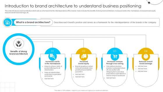 This slide introduces brand architecture which acts as a framework for the interdependence of the brands. It also includes the benefits of strong brand architecture, increased clarity in the marketplace, increased brand equity, reduced overall brand damage, etc. Crafting an eye-catching presentation has never been more straightforward. Let your presentation shine with this tasteful yet straightforward Brand Influence Introduction To Brand Architecture To Understand Strategy SS V template. It offers a minimalistic and classy look that is great for making a statement. The colors have been employed intelligently to add a bit of playfulness while still remaining professional. Construct the ideal Brand Influence Introduction To Brand Architecture To Understand Strategy SS V that effortlessly grabs the attention of your audience Begin now and be certain to wow your customers This slide introduces brand architecture which acts as a framework for the interdependence of the brands. It also includes the benefits of strong brand architecture, increased clarity in the marketplace, increased brand equity, reduced overall brand damage, etc.