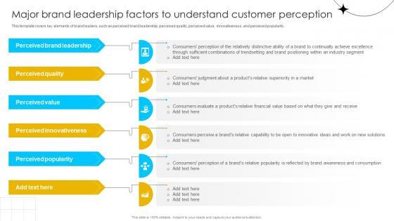 This template covers key elements of brand leaders, such as perceived brand leadership, perceived quality, perceived value, innovativeness, and perceived popularity. The best PPT templates are a great way to save time, energy, and resources. Slidegeeks have 100 percent editable powerpoint slides making them incredibly versatile. With these quality presentation templates, you can create a captivating and memorable presentation by combining visually appealing slides and effectively communicating your message. Download Brand Influence Major Brand Leadership Factors To Understand Customer Strategy SS V from Slidegeeks and deliver a wonderful presentation. This template covers key elements of brand leaders, such as perceived brand leadership, perceived quality, perceived value, innovativeness, and perceived popularity.