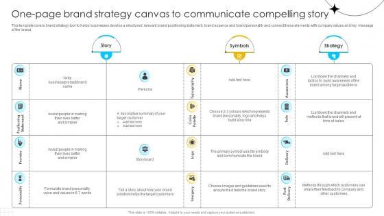 This template covers brand strategy tool to helps businesses develop a structured, relevant brand positioning statement, brand essence and brand personality and connect these elements with company values and key message of the brand. The Brand Influence One Page Brand Strategy Canvas To Communicate Compelling Strategy SS V is a compilation of the most recent design trends as a series of slides. It is suitable for any subject or industry presentation, containing attractive visuals and photo spots for businesses to clearly express their messages. This template contains a variety of slides for the user to input data, such as structures to contrast two elements, bullet points, and slides for written information. Slidegeeks is prepared to create an impression. This template covers brand strategy tool to helps businesses develop a structured, relevant brand positioning statement, brand essence and brand personality and connect these elements with company values and key message of the brand.