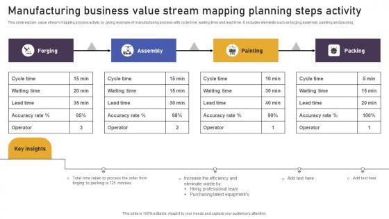 This slide explain value stream mapping process activity by giving example of manufacturing process with cycle time, waiting time and lead time. It includes elements such as forging assembly, painting and packing. Pitch your topic with ease and precision using this Manufacturing Business Value Stream Mapping Planning Steps Activity Information Pdf. This layout presents information on Forging, Assembly, Painting. It is also available for immediate download and adjustment. So, changes can be made in the color, design, graphics or any other component to create a unique layout. This slide explain value stream mapping process activity by giving example of manufacturing process with cycle time, waiting time and lead time. It includes elements such as forging assembly, painting and packing.