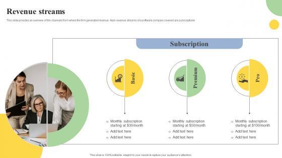 This slide provides an overview of the channels from where the firm generated revenue. Main revenue streams of a software company covered are subscriptions Coming up with a presentation necessitates that the majority of the effort goes into the content and the message you intend to convey. The visuals of a PowerPoint presentation can only be effective if it supplements and supports the story that is being told. Keeping this in mind our experts created Revenue Streams Cloud Based ERP Software Investor Financing Elevator Pitch Deck Information Pdf to reduce the time that goes into designing the presentation. This way, you can concentrate on the message while our designers take care of providing you with the right template for the situation. This slide provides an overview of the channels from where the firm generated revenue. Main revenue streams of a software company covered are subscriptions