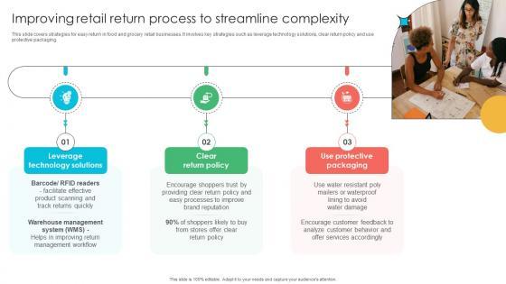 This slide covers strategies for easy return in food and grocery retail businesses. It involves key strategies such as leverage technology solutions, clear return policy and use protective packaging. Are you in need of a template that can accommodate all of your creative concepts This one is crafted professionally and can be altered to fit any style. Use it with Google Slides or PowerPoint. Include striking photographs, symbols, depictions, and other visuals. Fill, move around, or remove text boxes as desired. Test out color palettes and font mixtures. Edit and save your work, or work with colleagues. Download Marketing Strategies For Effective Improving Retail Return Process To Streamline and observe how to make your presentation outstanding. Give an impeccable presentation to your group and make your presentation unforgettable. This slide covers strategies for easy return in food and grocery retail businesses. It involves key strategies such as leverage technology solutions, clear return policy and use protective packaging.