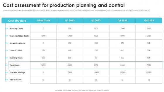 This slide provides glimpse about analyzing annual costs incurred in the new production planning and control system. It includes costs such as planning costs, implementation costs, scheduling costs, control costs, etc. There are so many reasons you need a Cost Assessment For Production Planning Streamlining Production Operational Formats PDF. The first reason is you can not spend time making everything from scratch, Thus, Slidegeeks has made presentation templates for you too. You can easily download these templates from our website easily. This slide provides glimpse about analyzing annual costs incurred in the new production planning and control system. It includes costs such as planning costs, implementation costs, scheduling costs, control costs, etc.