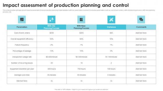 This slide provides glimpse about impact assessment of new production planning implementation with key parameters involved. It includes parameters such as cost of work orders, with old planning process, with new planning process, etc. Slidegeeks is here to make your presentations a breeze with Impact Assessment Of Production Planning Streamlining Production Operational Elements PDF With our easy-to-use and customizable templates, you can focus on delivering your ideas rather than worrying about formatting. With a variety of designs to choose from, you are sure to find one that suits your needs. And with animations and unique photos, illustrations, and fonts, you can make your presentation pop. So whether you are giving a sales pitch or presenting to the board, make sure to check out Slidegeeks first This slide provides glimpse about impact assessment of new production planning implementation with key parameters involved. It includes parameters such as cost of work orders, with old planning process, with new planning process, etc.
