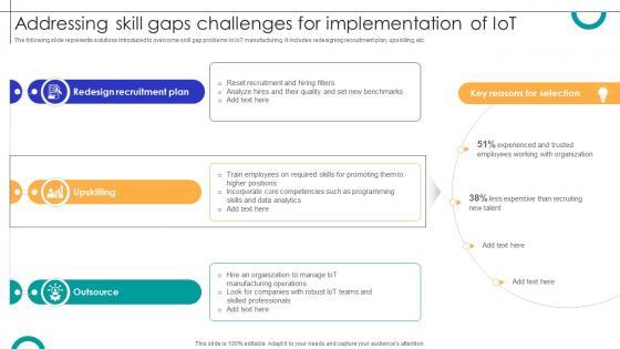 The following slide represents solutions introduced to overcome skill gap problems in IoT manufacturing. It includes redesigning recruitment plan, upskilling, etc. Do you have to make sure that everyone on your team knows about any specific topic I yes, then you should give Addressing Skill Gaps Challenges For Implementation Of IOT Streamlining Production Ppt Sample a try. Our experts have put a lot of knowledge and effort into creating this impeccable Addressing Skill Gaps Challenges For Implementation Of IOT Streamlining Production Ppt Sample You can use this template for your upcoming presentations, as the slides are perfect to represent even the tiniest detail. You can download these templates from the Slidegeeks website and these are easy to edit. So grab these today The following slide represents solutions introduced to overcome skill gap problems in IoT manufacturing. It includes redesigning recruitment plan, upskilling, etc.