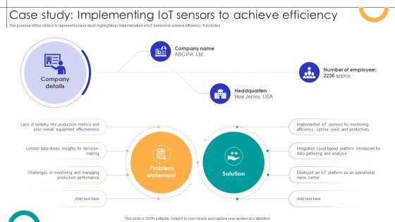 The purpose of this slide is to represent a case study highlighting implementation of IoT sensors to achieve efficiency. It includes Find highly impressive Case Study Implementing IOT Sensors To Achieve Efficiency Streamlining Production Ppt Example on Slidegeeks to deliver a meaningful presentation. You can save an ample amount of time using these presentation templates. No need to worry to prepare everything from scratch because Slidegeeks experts have already done a huge research and work for you. You need to download Case Study Implementing IOT Sensors To Achieve Efficiency Streamlining Production Ppt Example for your upcoming presentation. All the presentation templates are 100 percent editable and you can change the color and personalize the content accordingly. Download now The purpose of this slide is to represent a case study highlighting implementation of IoT sensors to achieve efficiency. It includes
