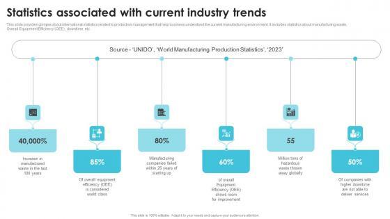 This slide provides glimpse about international statistics related to production management that help business understand the current manufacturing environment. It includes statistics about manufacturing waste, Overall Equipment Efficiency OEE, downtime, etc. Welcome to our selection of the Statistics Associated With Current Industry Trends Streamlining Production Operational Mockup PDF. These are designed to help you showcase your creativity and bring your sphere to life. Planning and Innovation are essential for any business that is just starting out. This collection contains the designs that you need for your everyday presentations. All of our PowerPoints are 100 percent editable, so you can customize them to suit your needs. This multi-purpose template can be used in various situations. Grab these presentation templates today This slide provides glimpse about international statistics related to production management that help business understand the current manufacturing environment. It includes statistics about manufacturing waste, Overall Equipment Efficiency OEE, downtime, etc.
