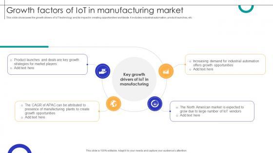This slide showcases the growth drivers of IoT technology and its impact in creating opportunities worldwide. It includes industrial automation, product launches, etc. Are you searching for a Growth Factors Of IOT In Manufacturing Market Streamlining Production Ppt Sample that is uncluttered, straightforward, and original Its easy to edit, and you can change the colors to suit your personal or business branding. For a presentation that expresses how much effort you have put in, this template is ideal With all of its features, including tables, diagrams, statistics, and lists, its perfect for a business plan presentation. Make your ideas more appealing with these professional slides. Download Growth Factors Of IOT In Manufacturing Market Streamlining Production Ppt Sample from Slidegeeks today. This slide showcases the growth drivers of IoT technology and its impact in creating opportunities worldwide. It includes industrial automation, product launches, etc.