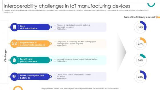 This slide aims to analyze interoperability challenges faced by organizations in IoT ecosystem of manufacturing devices. It includes lack of standardization, fragmentation of communication protocols, security and privacy concerns, etc. Do you know about Slidesgeeks Interoperability Challenges In IOT Manufacturing Devices Streamlining Production Ppt Presentation These are perfect for delivering any kind od presentation. Using it, create PowerPoint presentations that communicate your ideas and engage audiences. Save time and effort by using our pre-designed presentation templates that are perfect for a wide range of topic. Our vast selection of designs covers a range of styles, from creative to business, and are all highly customizable and easy to edit. Download as a PowerPoint template or use them as Google Slides themes. This slide aims to analyze interoperability challenges faced by organizations in IoT ecosystem of manufacturing devices. It includes lack of standardization, fragmentation of communication protocols, security and privacy concerns, etc.