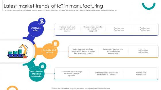 The following slide represents market trends of IoT technology in the manufacturing industry. It includes various trends such as employee safety, security and privacy, etc. Find a pre-designed and impeccable Latest Market Trends Of IOT In Manufacturing Streamlining Production Ppt Powerpoint The templates can ace your presentation without additional effort. You can download these easy-to-edit presentation templates to make your presentation stand out from others. So, what are you waiting for Download the template from Slidegeeks today and give a unique touch to your presentation. The following slide represents market trends of IoT technology in the manufacturing industry. It includes various trends such as employee safety, security and privacy, etc.