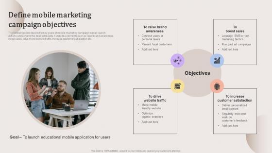 The following slide depicts the key goals of mobile marketing campaign to plan launch actions and achieve the desired results. It includes elements such as raise brand awareness, boost sales, drive more website traffic, increase customer satisfaction etc.Here you can discover an assortment of the finest PowerPoint and Google Slides templates. With these templates, you can create presentations for a variety of purposes while simultaneously providing your audience with an eye-catching visual experience. Download Define Mobile Marketing Campaign Evaluating Strengths And Weaknesses Download Pdf to deliver an impeccable presentation. These templates will make your job of preparing presentations much quicker, yet still, maintain a high level of quality. Slidegeeks has experienced researchers who prepare these templates and write high-quality content for you. Later on, you can personalize the content by editing the Define Mobile Marketing Campaign Evaluating Strengths And Weaknesses Download Pdf. The following slide depicts the key goals of mobile marketing campaign to plan launch actions and achieve the desired results. It includes elements such as raise brand awareness, boost sales, drive more website traffic, increase customer satisfaction etc.