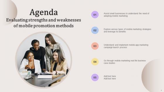 Are you searching for a Agenda Evaluating Strengths And Weaknesses Of Mobile Promotion Methods Inspiration Pdf that is uncluttered, straightforward, and original Its easy to edit, and you can change the colors to suit your personal or business branding. For a presentation that expresses how much effort you have put in, this template is ideal. With all of its features, including tables, diagrams, statistics, and lists, its perfect for a business plan presentation. Make your ideas more appealing with these professional slides. Download Agenda Evaluating Strengths And Weaknesses Of Mobile Promotion Methods Inspiration Pdf from Slidegeeks today. Our Agenda Evaluating Strengths And Weaknesses Of Mobile Promotion Methods Inspiration Pdf are topically designed to provide an attractive backdrop to any subject. Use them to look like a presentation pro.