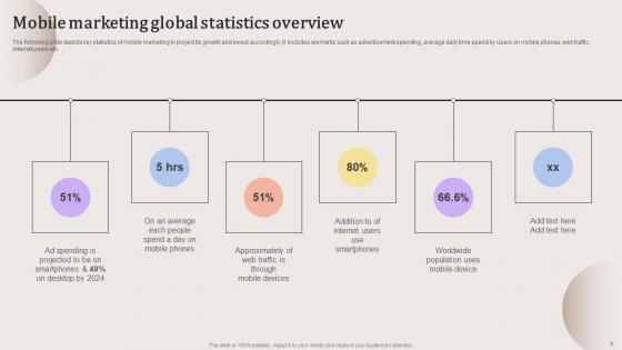 The following slide depicts key statistics of mobile marketing to project its growth and invest accordingly. It includes elements such as advertisement spending, average daily time spend by users on mobile phones, web traffic, internet users etc.If you are looking for a format to display your unique thoughts, then the professionally designed Mobile Marketing Global Statistics Overview Evaluating Strengths And Weaknesses Template Pdf is the one for you. You can use it as a Google Slides template or a PowerPoint template. Incorporate impressive visuals, symbols, images, and other charts. Modify or reorganize the text boxes as you desire. Experiment with shade schemes and font pairings. Alter, share or cooperate with other people on your work. Download Mobile Marketing Global Statistics Overview Evaluating Strengths And Weaknesses Template Pdf and find out how to give a successful presentation. Present a perfect display to your team and make your presentation unforgettable. The following slide depicts key statistics of mobile marketing to project its growth and invest accordingly. It includes elements such as advertisement spending, average daily time spend by users on mobile phones, web traffic, internet users etc.