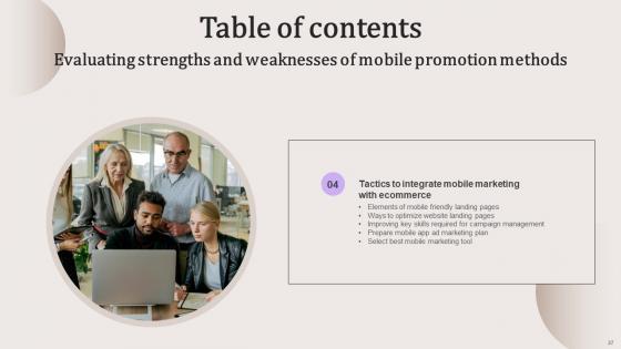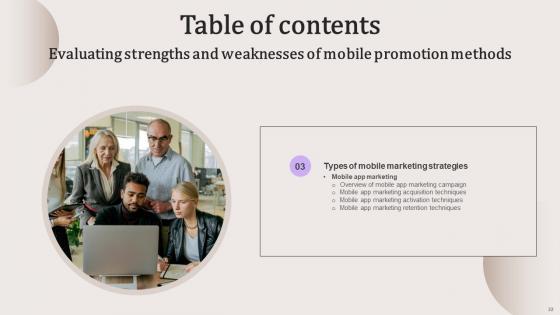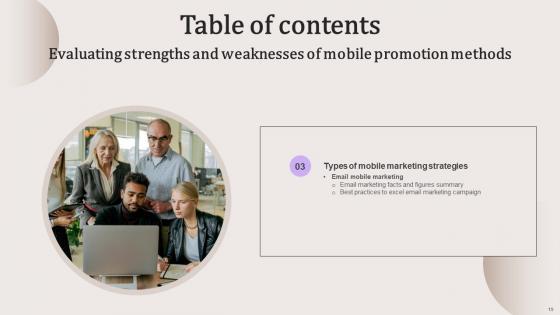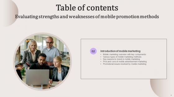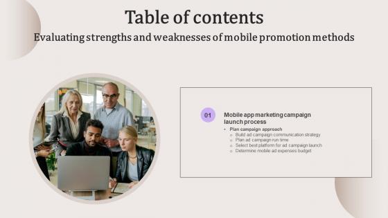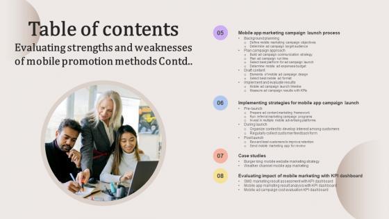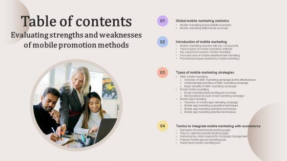 Do you know about Slidesgeeks Table Of Contents Evaluating Strengths And Weaknesses Of Mobile Promotion Metho Ideas Pdf These are perfect for delivering any kind od presentation. Using it, create PowerPoint presentations that communicate your ideas and engage audiences. Save time and effort by using our pre-designed presentation templates that are perfect for a wide range of topic. Our vast selection of designs covers a range of styles, from creative to business, and are all highly customizable and easy to edit. Download as a PowerPoint template or use them as Google Slides themes. Our Table Of Contents Evaluating Strengths And Weaknesses Of Mobile Promotion Metho Ideas Pdf are topically designed to provide an attractive backdrop to any subject. Use them to look like a presentation pro.