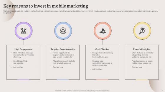 The following slide highlights multiple benefits of mobile promotion to encourage marketing investment and drive more web traffic. It includes elements such as high engagement, targeted communication, cost effective, powerful insights etc.Do you have to make sure that everyone on your team knows about any specific topic I yes, then you should give Key Reasons To Invest In Mobile Marketing Evaluating Strengths And Weaknesses Structure Pdf a try. Our experts have put a lot of knowledge and effort into creating this impeccable Key Reasons To Invest In Mobile Marketing Evaluating Strengths And Weaknesses Structure Pdf. You can use this template for your upcoming presentations, as the slides are perfect to represent even the tiniest detail. You can download these templates from the Slidegeeks website and these are easy to edit. So grab these today. The following slide highlights multiple benefits of mobile promotion to encourage marketing investment and drive more web traffic. It includes elements such as high engagement, targeted communication, cost effective, powerful insights etc.