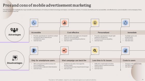 The following slide highlights the major benefits and drawbacks of mobile promotion to leverage and deploy cost effective actions. It includes elements such as accessibility, cost effectiveness, personalization, viral campaigns, fixing issues, costs to users etc. The best PPT templates are a great way to save time, energy, and resources. Slidegeeks have 100Precent editable powerpoint slides making them incredibly versatile. With these quality presentation templates, you can create a captivating and memorable presentation by combining visually appealing slides and effectively communicating your message. Download Pros And Cons Of Mobile Advertisement Evaluating Strengths And Weaknesses Background Pdf from Slidegeeks and deliver a wonderful presentation. The following slide highlights the major benefits and drawbacks of mobile promotion to leverage and deploy cost effective actions. It includes elements such as accessibility, cost effectiveness, personalization, viral campaigns, fixing issues, costs to users etc.