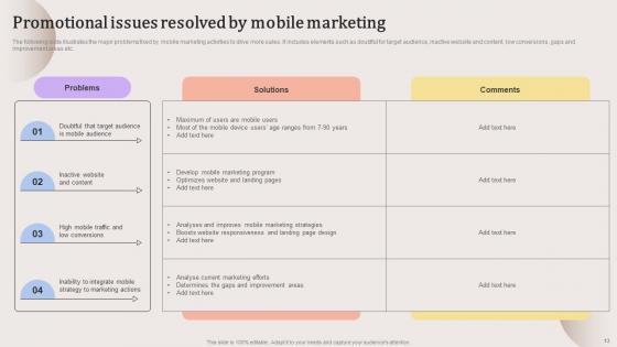 The following slide illustrates the major problems fixed by mobile marketing activities to drive more sales. It includes elements such as doubtful for target audience, inactive website and content, low conversions, gaps and improvement areas etc. Explore a selection of the finest Promotional Issues Resolved By Mobile Evaluating Strengths And Weaknesses Infographics Pdf here. With a plethora of professionally designed and pre-made slide templates, you can quickly and easily find the right one for your upcoming presentation. You can use our Promotional Issues Resolved By Mobile Evaluating Strengths And Weaknesses Infographics Pdf to effectively convey your message to a wider audience. Slidegeeks has done a lot of research before preparing these presentation templates. The content can be personalized and the slides are highly editable. Grab templates today from Slidegeeks. The following slide illustrates the major problems fixed by mobile marketing activities to drive more sales. It includes elements such as doubtful for target audience, inactive website and content, low conversions, gaps and improvement areas etc.
