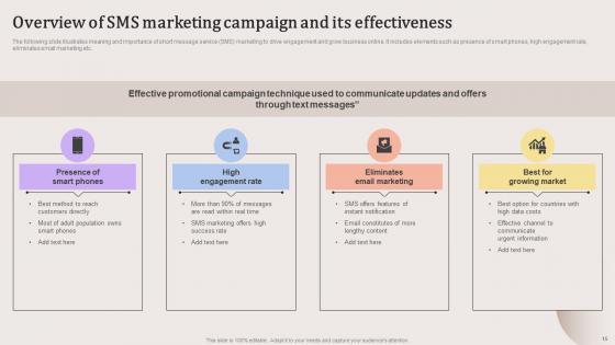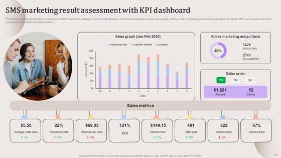 The following slide depicts the key outcomes of SMS promotion strategy to track its effectiveness. It includes elements such as sales graph, metrics, order, marketing subscribers, average order value, SMS sent, revenue per click, conversion rate, return on investment etc. Take your projects to the next level with our ultimate collection of SMS Marketing Result Assessment With KPI Evaluating Strengths And Weaknesses Formats Pdf. Slidegeeks has designed a range of layouts that are perfect for representing task or activity duration, keeping track of all your deadlines at a glance. Tailor these designs to your exact needs and give them a truly corporate look with your own brand colors they all make your projects stand out from the rest. The following slide depicts the key outcomes of SMS promotion strategy to track its effectiveness. It includes elements such as sales graph, metrics, order, marketing subscribers, average order value, SMS sent, revenue per click, conversion rate, return on investment etc.