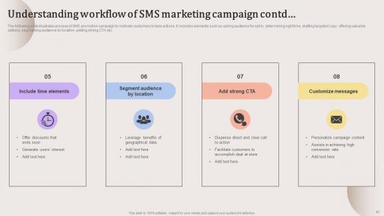 The following slide illustrates process of SMS promotion campaign to motivate customers to take actions. It includes elements such as asking audience for opt in, determining right time, drafting targeted copy, offering valuable options, segmenting audience by location, adding strong CTA etc.Find a pre-designed and impeccable Understanding Workflow Of SMS Evaluating Strengths And Weaknesses Background Pdf. The templates can ace your presentation without additional effort. You can download these easy-to-edit presentation templates to make your presentation stand out from others. So, what are you waiting for Download the template from Slidegeeks today and give a unique touch to your presentation. The following slide illustrates process of SMS promotion campaign to motivate customers to take actions. It includes elements such as asking audience for opt in, determining right time, drafting targeted copy, offering valuable options, segmenting audience by location, adding strong CTA etc.
