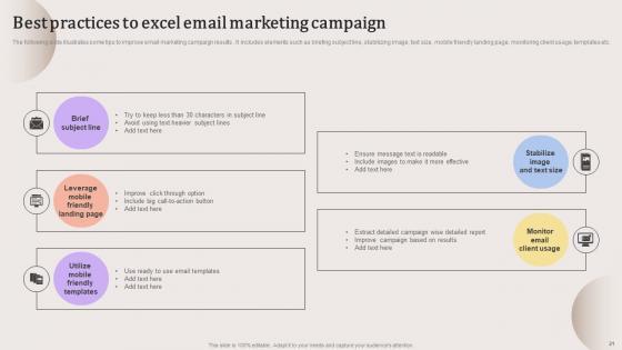The following slide illustrates some tips to improve email marketing campaign results . It includes elements such as briefing subject line, stabilizing image, text size, mobile friendly landing page, monitoring client usage, templates etc.Retrieve professionally designed Best Practices To Excel Email Marketing Evaluating Strengths And Weaknesses Template Pdf to effectively convey your message and captivate your listeners. Save time by selecting pre-made slideshows that are appropriate for various topics, from business to educational purposes. These themes come in many different styles, from creative to corporate, and all of them are easily adjustable and can be edited quickly. Access them as PowerPoint templates or as Google Slides themes. You do not have to go on a hunt for the perfect presentation because Slidegeeks got you covered from everywhere. The following slide illustrates some tips to improve email marketing campaign results . It includes elements such as briefing subject line, stabilizing image, text size, mobile friendly landing page, monitoring client usage, templates etc.