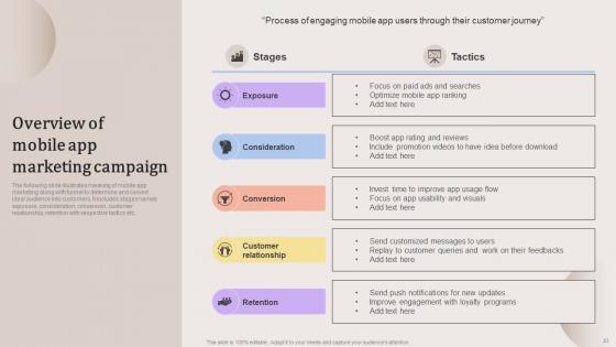 The following slide illustrates meaning of mobile app marketing along with funnel to determine and convert ideal audience into customers. It includes stages namely exposure, consideration, conversion, customer relationship, retention with respective tactics etc. Formulating a presentation can take up a lot of effort and time, so the content and message should always be the primary focus. The visuals of the PowerPoint can enhance the presenters message, so our Overview Of Mobile App Marketing Evaluating Strengths And Weaknesses Inspiration Pdf was created to help save time. Instead of worrying about the design, the presenter can concentrate on the message while our designers work on creating the ideal templates for whatever situation is needed. Slidegeeks has experts for everything from amazing designs to valuable content, we have put everything into Overview Of Mobile App Marketing Evaluating Strengths And Weaknesses Inspiration Pdf. The following slide illustrates meaning of mobile app marketing along with funnel to determine and convert ideal audience into customers. It includes stages namely exposure, consideration, conversion, customer relationship, retention with respective tactics etc.