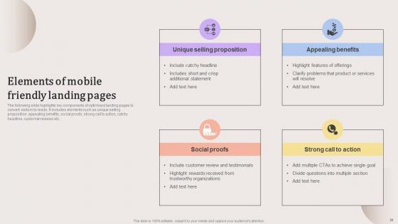 The following slide highlights key components of optimized landing pages to convert visitors to leads. It includes elements such as unique selling proposition, appealing benefits, social proofs, strong call to action, catchy headline, customer reviews etc.Find a pre-designed and impeccable Elements Of Mobile Friendly Landing Pages Evaluating Strengths And Weaknesses Brochure Pdf. The templates can ace your presentation without additional effort. You can download these easy-to-edit presentation templates to make your presentation stand out from others. So, what are you waiting for Download the template from Slidegeeks today and give a unique touch to your presentation. The following slide highlights key components of optimized landing pages to convert visitors to leads. It includes elements such as unique selling proposition, appealing benefits, social proofs, strong call to action, catchy headline, customer reviews etc.