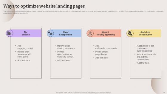 The following slide illustrates some practices to improve website landing page performance. It includes elements such as concise, responsive, visually appealing, click to call button, page viewing experience, multimedia components, page design, customer queries etc.Create an editable Ways To Optimize Website Landing Pages Evaluating Strengths And Weaknesses Introduction Pdf that communicates your idea and engages your audience. Whether you are presenting a business or an educational presentation, pre-designed presentation templates help save time. Ways To Optimize Website Landing Pages Evaluating Strengths And Weaknesses Introduction Pdf is highly customizable and very easy to edit, covering many different styles from creative to business presentations. Slidegeeks has creative team members who have crafted amazing templates. So, go and get them without any delay. The following slide illustrates some practices to improve website landing page performance. It includes elements such as concise, responsive, visually appealing, click to call button, page viewing experience, multimedia components, page design, customer queries etc.