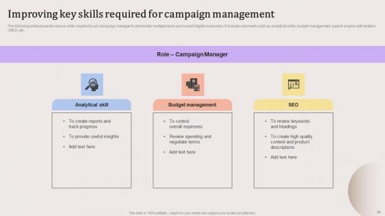 The following slide presents various skills required by ad campaign manager to administer multiple tasks and convert digital customers. It includes elements such as analytical skills, budget management, search engine optimization SEO etc.There are so many reasons you need a Improving Key Skills Required For Evaluating Strengths And Weaknesses Infographics Pdf. The first reason is you can not spend time making everything from scratch, Thus, Slidegeeks has made presentation templates for you too. You can easily download these templates from our website easily. The following slide presents various skills required by ad campaign manager to administer multiple tasks and convert digital customers. It includes elements such as analytical skills, budget management, search engine optimization SEO etc.