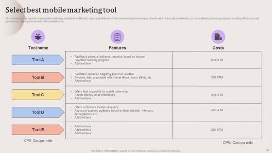 The following slide depicts some mobile marketing advertisement tools to target potential customers and leverage advantages of automation. It includes elements such as simplifying tracking progress, boosting efficacy and ad promotions, offering customer location analytics etc. Presenting this PowerPoint presentation, titled Select Best Mobile Marketing Tool Evaluating Strengths And Weaknesses Ideas Pdf, with topics curated by our researchers after extensive research. This editable presentation is available for immediate download and provides attractive features when used. Download now and captivate your audience. Presenting this Select Best Mobile Marketing Tool Evaluating Strengths And Weaknesses Ideas Pdf. Our researchers have carefully researched and created these slides with all aspects taken into consideration. This is a completely customizable Select Best Mobile Marketing Tool Evaluating Strengths And Weaknesses Ideas Pdf that is available for immediate downloading. Download now and make an impact on your audience. Highlight the attractive features available with our PPTs. The following slide depicts some mobile marketing advertisement tools to target potential customers and leverage advantages of automation. It includes elements such as simplifying tracking progress, boosting efficacy and ad promotions, offering customer location analytics etc.