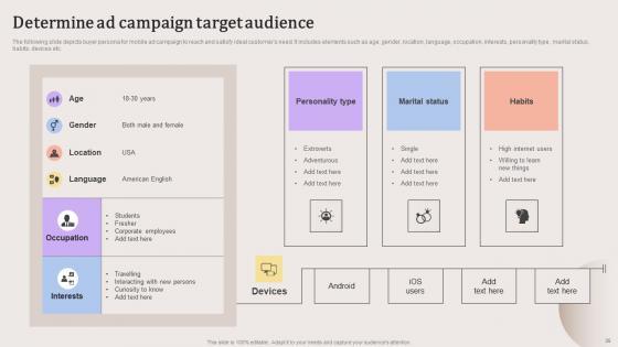 The following slide depicts buyer persona for mobile ad campaign to reach and satisfy ideal customers need. It includes elements such as age, gender, location, language, occupation, interests, personality type, marital status, habits, devices etc.This Determine Ad Campaign Target Audience Evaluating Strengths And Weaknesses Inspiration Pdf from Slidegeeks makes it easy to present information on your topic with precision. It provides customization options, so you can make changes to the colors, design, graphics, or any other component to create a unique layout. It is also available for immediate download, so you can begin using it right away. Slidegeeks has done good research to ensure that you have everything you need to make your presentation stand out. Make a name out there for a brilliant performance. The following slide depicts buyer persona for mobile ad campaign to reach and satisfy ideal customers need. It includes elements such as age, gender, location, language, occupation, interests, personality type, marital status, habits, devices etc.