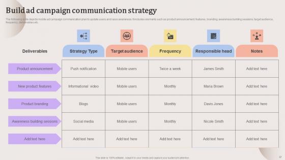 The following slide depicts mobile ad campaign communication plan to update users and raise awareness. It includes elements such as product announcement, features, branding, awareness building sessions, target audience, frequency, deliverables etc.Slidegeeks has constructed Build Ad Campaign Communication Evaluating Strengths And Weaknesses Icons Pdf after conducting extensive research and examination. These presentation templates are constantly being generated and modified based on user preferences and critiques from editors. Here, you will find the most attractive templates for a range of purposes while taking into account ratings and remarks from users regarding the content. This is an excellent jumping-off point to explore our content and will give new users an insight into our top-notch PowerPoint Templates. The following slide depicts mobile ad campaign communication plan to update users and raise awareness. It includes elements such as product announcement, features, branding, awareness building sessions, target audience, frequency, deliverables etc.
