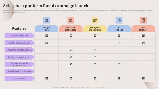 The following slide showcases the comparison of various platforms to launch mobile ad campaign and bring more potential customers to business. It includes elements such as text, images, advanced targeting options, ad views, impressions, videos, formats etc. Here you can discover an assortment of the finest PowerPoint and Google Slides templates. With these templates, you can create presentations for a variety of purposes while simultaneously providing your audience with an eye-catching visual experience. Download Select Best Platform For Ad Campaign Launch Evaluating Strengths And Weaknesses Clipart Pdf to deliver an impeccable presentation. These templates will make your job of preparing presentations much quicker, yet still, maintain a high level of quality. Slidegeeks has experienced researchers who prepare these templates and write high-quality content for you. Later on, you can personalize the content by editing the Select Best Platform For Ad Campaign Launch Evaluating Strengths And Weaknesses Clipart Pdf. The following slide showcases the comparison of various platforms to launch mobile ad campaign and bring more potential customers to business. It includes elements such as text, images, advanced targeting options, ad views, impressions, videos, formats etc.