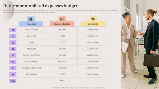 The following slide depicts campaign launch budget to estimate costs and earn better return on investments ROI. It includes elements such as market research, beat testing, tools, agency fee, cost per action, in app purchase, average cost per install etc.Take your projects to the next level with our ultimate collection of Determine Mobile Ad Expenses Budget Evaluating Strengths And Weaknesses Template Pdf. Slidegeeks has designed a range of layouts that are perfect for representing task or activity duration, keeping track of all your deadlines at a glance. Tailor these designs to your exact needs and give them a truly corporate look with your own brand colors they all make your projects stand out from the rest. The following slide depicts campaign launch budget to estimate costs and earn better return on investments ROI. It includes elements such as market research, beat testing, tools, agency fee, cost per action, in app purchase, average cost per install etc.