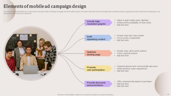 The following slide illustrates key components to design mobile marketing campaign and drive better results. It includes elements such as including high resolution graphics, appealing content, optimized landing page, user participation, discounts, promotions etc.Do you know about Slidesgeeks Elements Of Mobile Ad Campaign Design Evaluating Strengths And Weaknesses Template Pdf These are perfect for delivering any kind od presentation. Using it, create PowerPoint presentations that communicate your ideas and engage audiences. Save time and effort by using our pre-designed presentation templates that are perfect for a wide range of topic. Our vast selection of designs covers a range of styles, from creative to business, and are all highly customizable and easy to edit. Download as a PowerPoint template or use them as Google Slides themes. The following slide illustrates key components to design mobile marketing campaign and drive better results. It includes elements such as including high resolution graphics, appealing content, optimized landing page, user participation, discounts, promotions etc.