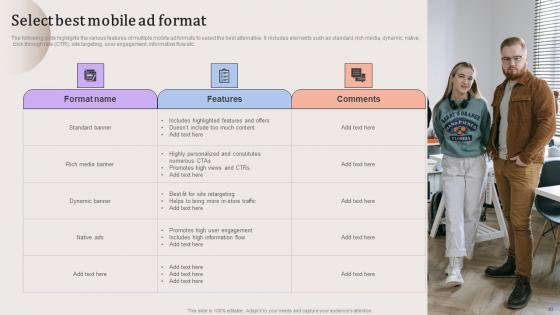 The following slide highlights the various features of multiple mobile ad formats to select the best alternative. It includes elements such as standard, rich media, dynamic, native, click through rate CTR, site targeting, user engagement, information flow etc.Slidegeeks has constructed Select Best Mobile Ad Format Evaluating Strengths And Weaknesses Portrait Pdf after conducting extensive research and examination. These presentation templates are constantly being generated and modified based on user preferences and critiques from editors. Here, you will find the most attractive templates for a range of purposes while taking into account ratings and remarks from users regarding the content. This is an excellent jumping-off point to explore our content and will give new users an insight into our top-notch PowerPoint Templates. The following slide highlights the various features of multiple mobile ad formats to select the best alternative. It includes elements such as standard, rich media, dynamic, native, click through rate CTR, site targeting, user engagement, information flow etc.