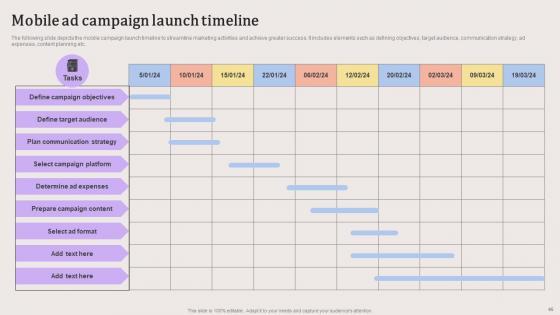 The following slide depicts the mobile campaign launch timeline to streamline marketing activities and achieve greater success. It includes elements such as defining objectives, target audience, communication strategy, ad expenses, content planning etc.Slidegeeks is here to make your presentations a breeze with Mobile Ad Campaign Launch Timeline Evaluating Strengths And Weaknesses Portrait Pdf With our easy-to-use and customizable templates, you can focus on delivering your ideas rather than worrying about formatting. With a variety of designs to choose from, you are sure to find one that suits your needs. And with animations and unique photos, illustrations, and fonts, you can make your presentation pop. So whether you are giving a sales pitch or presenting to the board, make sure to check out Slidegeeks first. The following slide depicts the mobile campaign launch timeline to streamline marketing activities and achieve greater success. It includes elements such as defining objectives, target audience, communication strategy, ad expenses, content planning etc.
