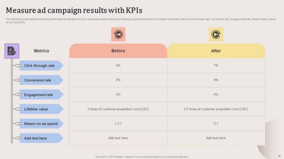 The following slide depicts some key performance indicators to track campaign performance and strategic goals achievement. It includes elements such as click through rate, conversion rate, engagement rate, lifetime value, return on as spend etc.From laying roadmaps to briefing everything in detail, our templates are perfect for you. You can set the stage with your presentation slides. All you have to do is download these easy-to-edit and customizable templates. Measure Ad Campaign Results With KPIs Evaluating Strengths And Weaknesses Elements Pdf will help you deliver an outstanding performance that everyone would remember and praise you for. Do download this presentation today. The following slide depicts some key performance indicators to track campaign performance and strategic goals achievement. It includes elements such as click through rate, conversion rate, engagement rate, lifetime value, return on as spend etc.