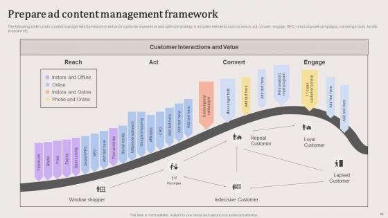The following slide covers content management framework to enhance customer experience and optimize strategy, It includes elements such as reach, act, convert, engage, SEO, omni channel campaigns, messenger bots, loyalty program etc. This Prepare Ad Content Management Evaluating Strengths And Weaknesses Designs Pdf is perfect for any presentation, be it in front of clients or colleagues. It is a versatile and stylish solution for organizing your meetings. The product name features a modern design for your presentation meetings. The adjustable and customizable slides provide unlimited possibilities for acing up your presentation. Slidegeeks has done all the homework before launching the product for you. So, do not wait, grab the presentation templates today The following slide covers content management framework to enhance customer experience and optimize strategy, It includes elements such as reach, act, convert, engage, SEO, omni channel campaigns, messenger bots, loyalty program etc.